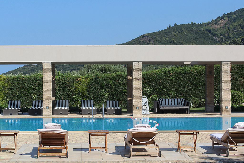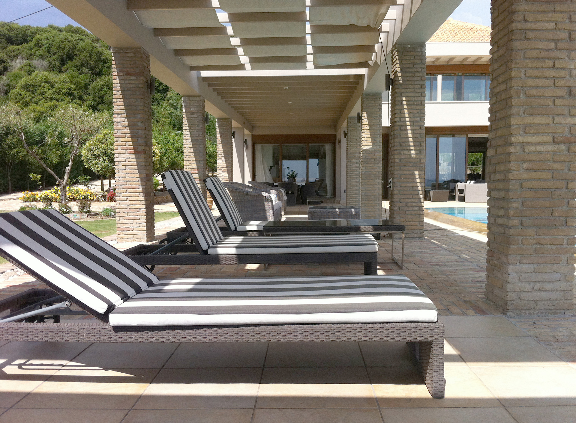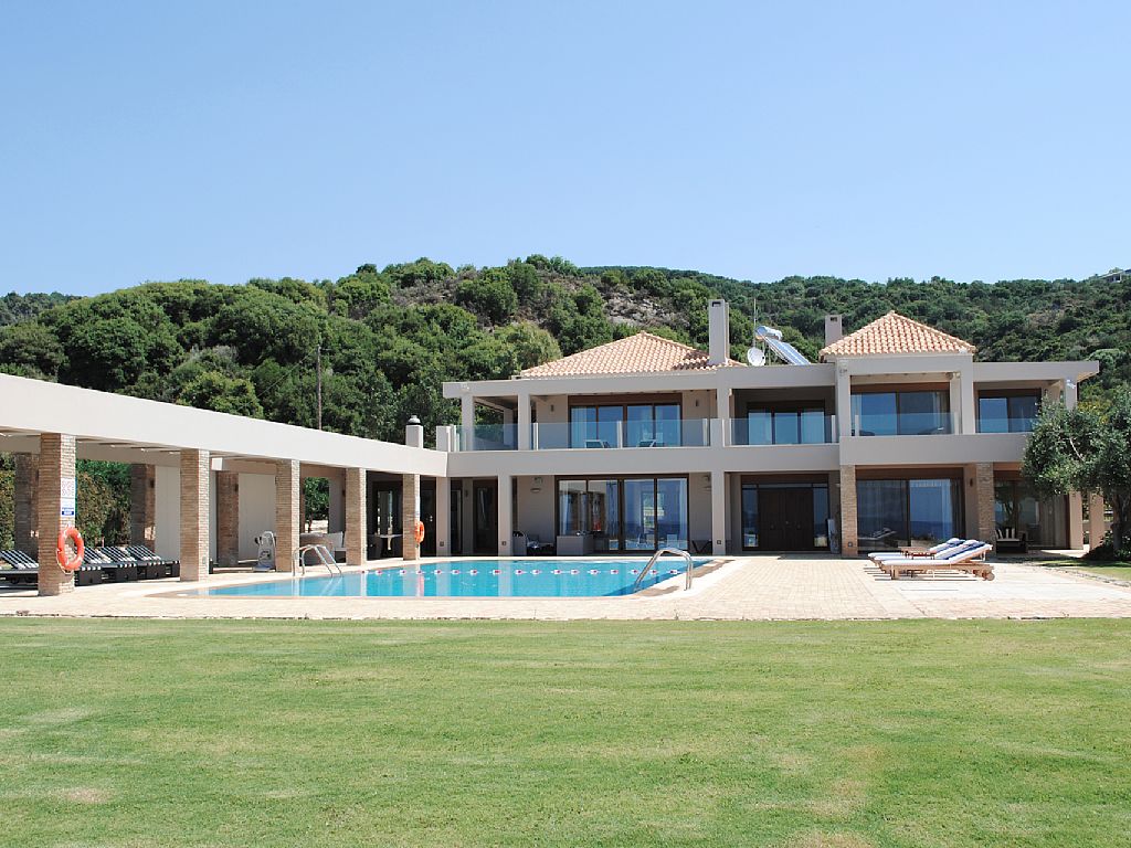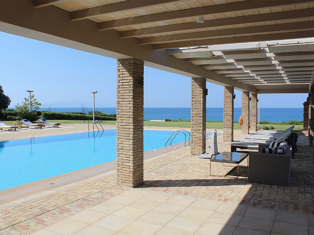 The swimming pool is set in front of the villa and surrounded by well maintained lawn and gardens, on one side a covered area runs the length of the pool ensuring that you have the choice of sun or shade throughout the day. Swimming in the pool is a wonderful mix of the lush green of the garden and the brilliant blue of the Ionian Sea. The pool area is equipped with sun loungers and outdoor showers. Guests may spend long lazy afternoons lying in the sun, enjoying a refreshing drink taking in the gorgeous view across the sea and the complete tranquility.