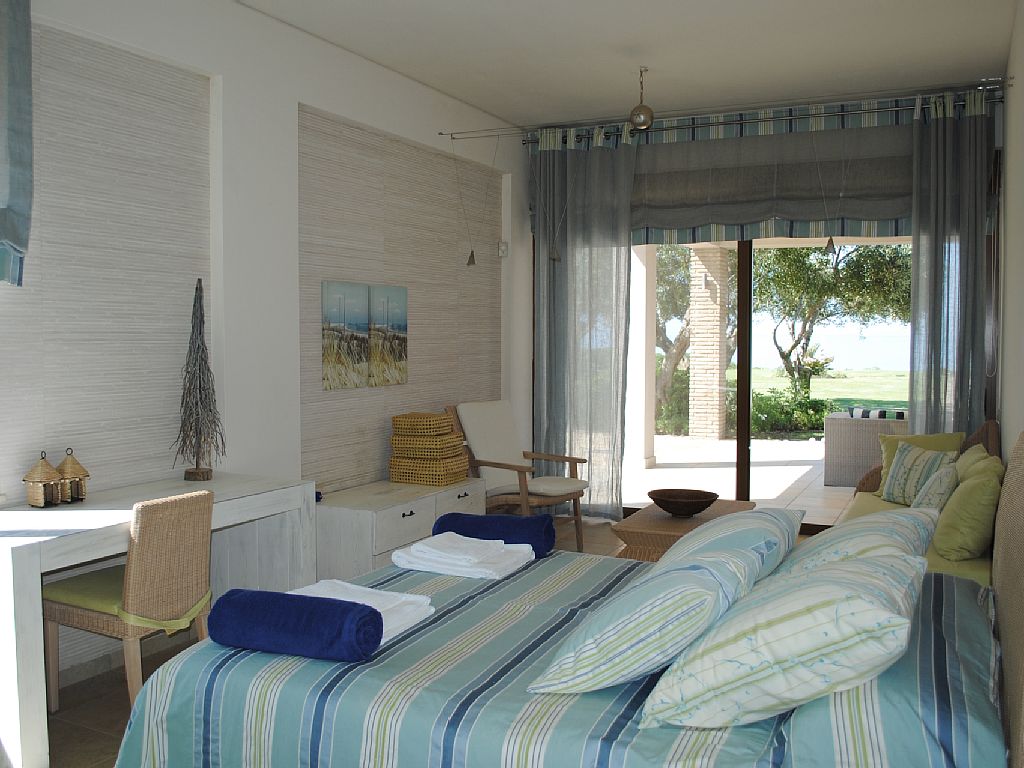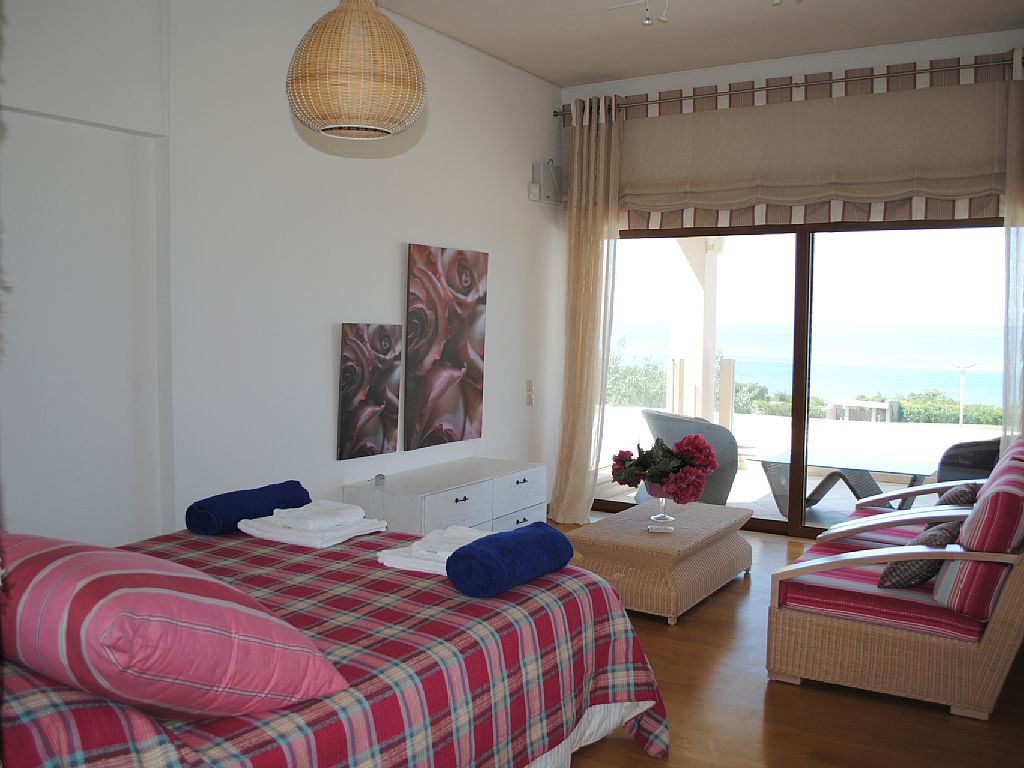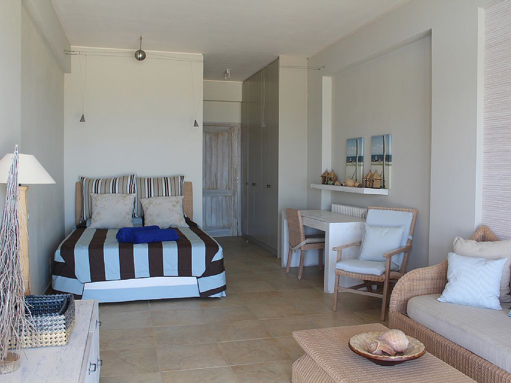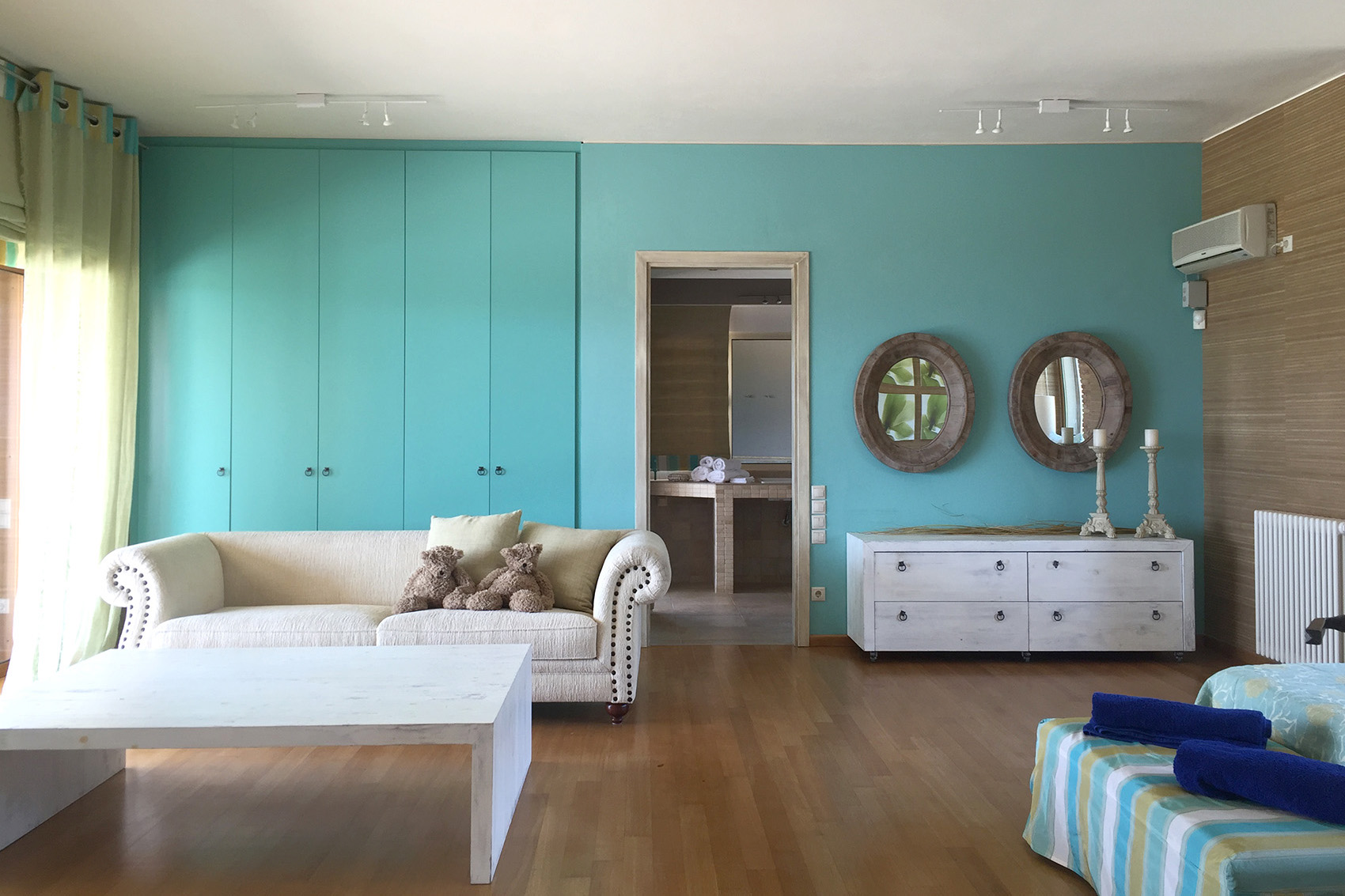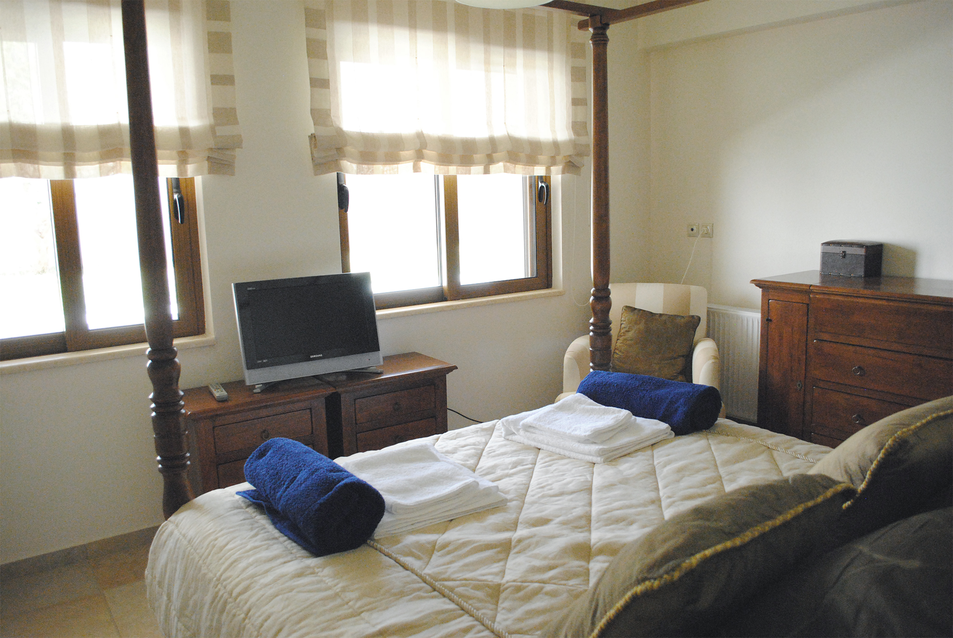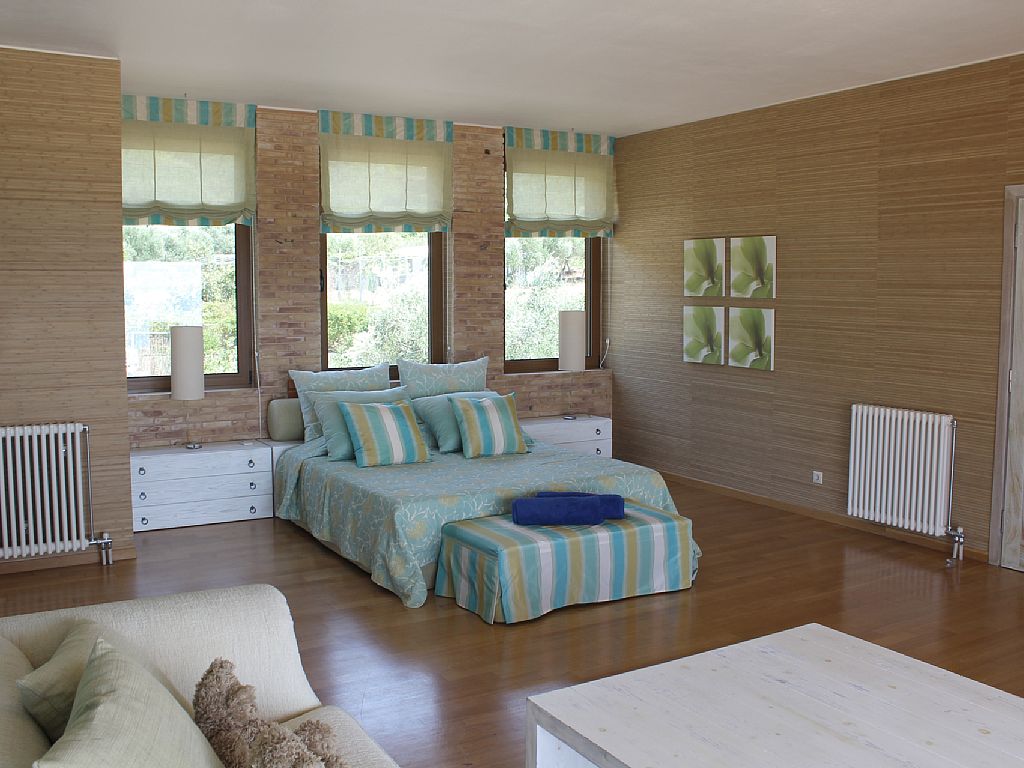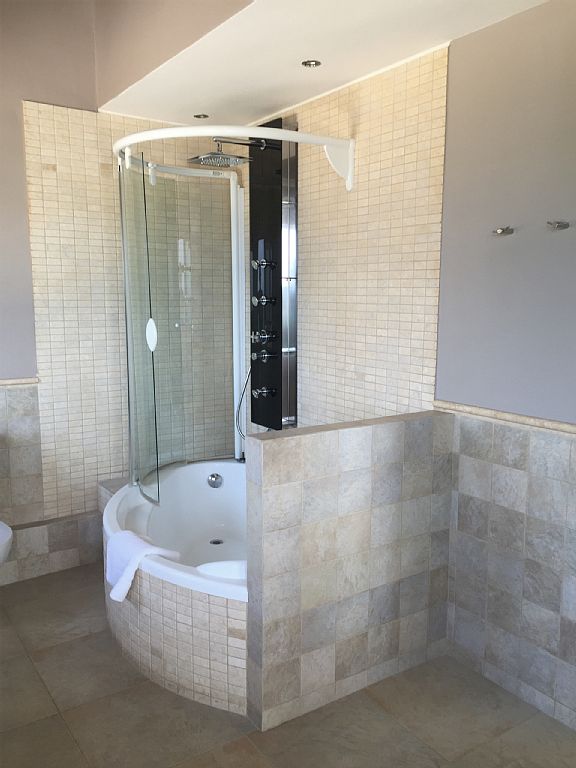 The impressive Master Suite has a large living room with comfy sofas and a private balcony with outdoor furniture for you to relax and enjoy the amazing sea views and sunsets. The king size double bed backs onto large windows ensuring gorgeous Mediterranean sunlight flood the room. The Italian tiled en-suite is made complete with its own bath with stand up shower Jet Jacuzzi system.