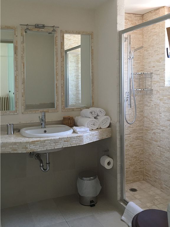 The Family Suite with king size bed, comfy sofa with adjoining room with twin beds shares an en-suite bathroom with shower. Both rooms in the Family Suite have private balconies overlooking the sea and individual comfy sofas within the rooms.